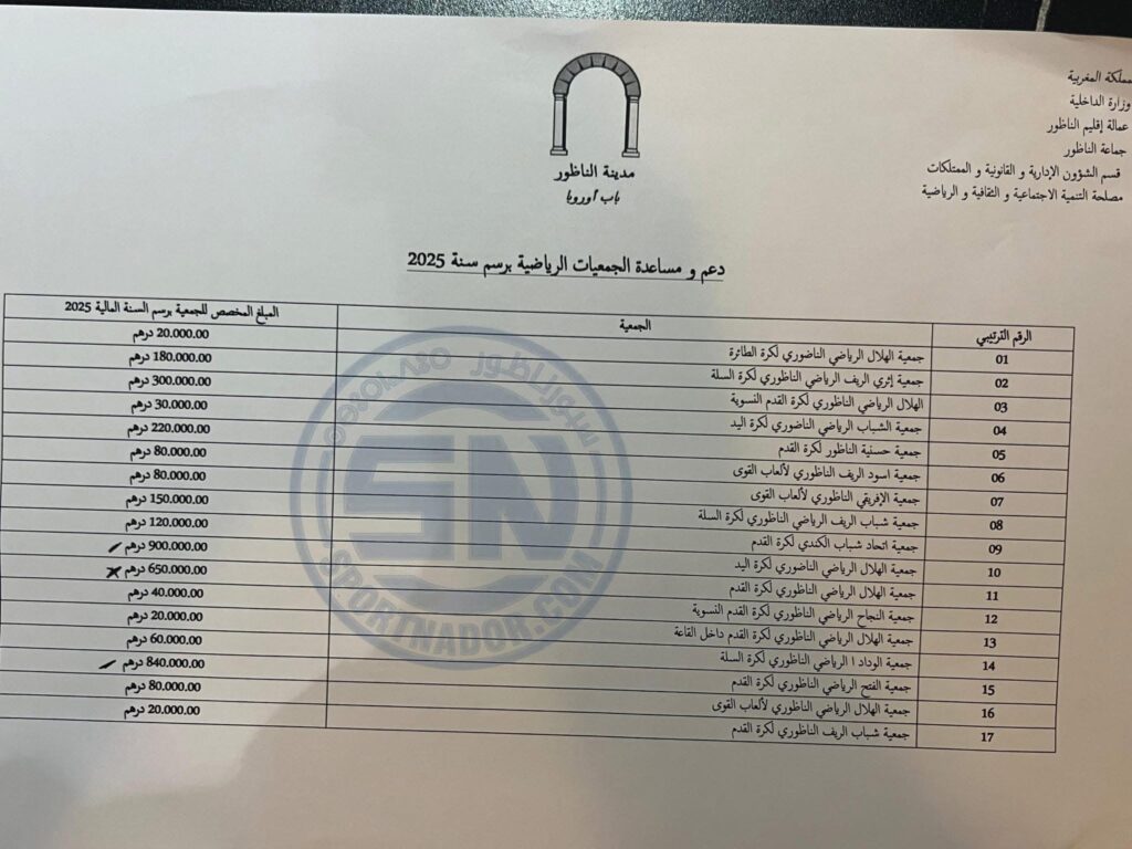 صادقت جماعة الناظور على لائحة الجمعيات الرياضية المستفيدة من الدعم المالي برسم سنة 2025، وذلك في إطار البرنامج السنوي المخصص لمساندة الأندية والجمعيات النشيطة داخل المدينة.