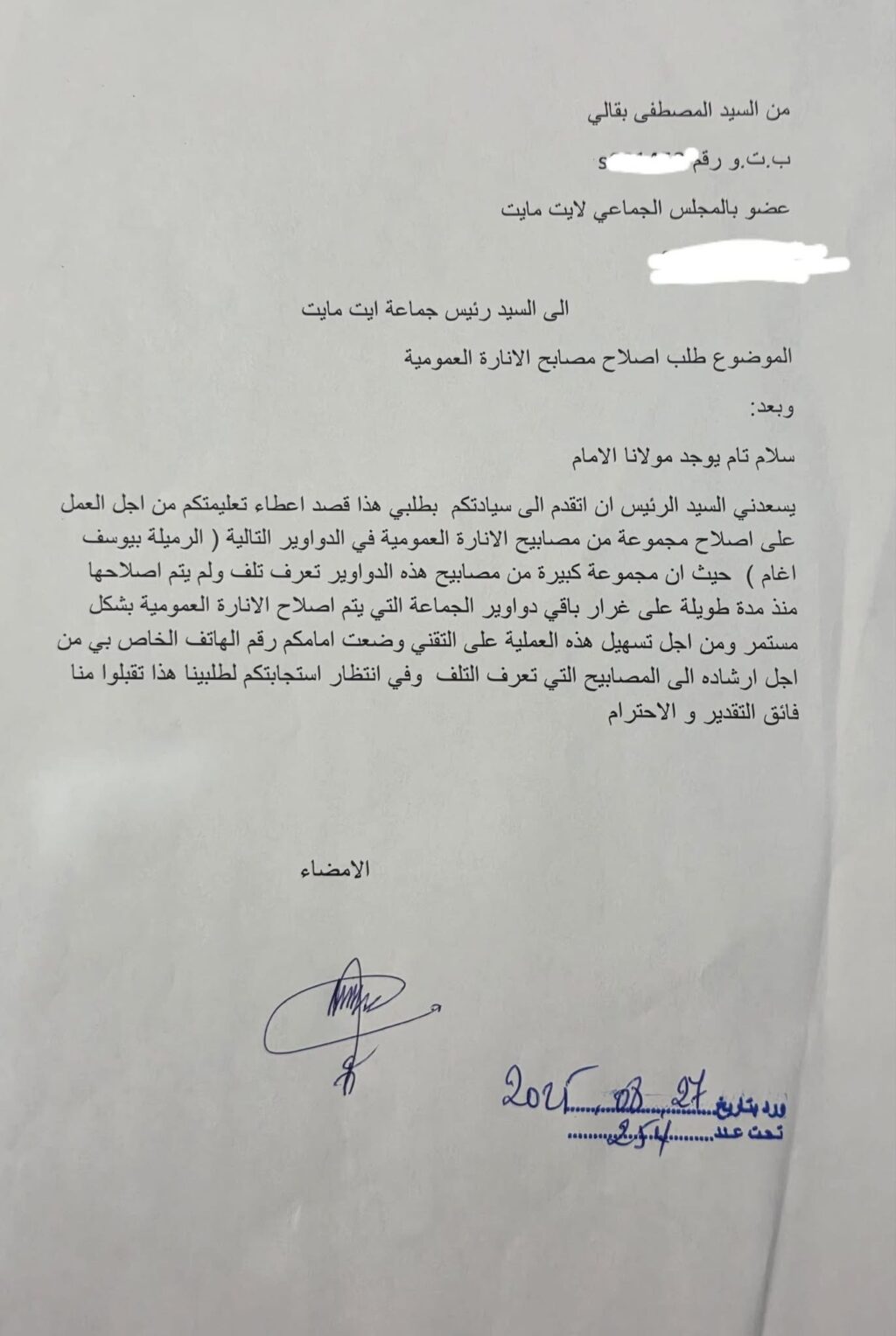 وفي هذا السياق، سبق لعضو المجلس الجماعي مصطفى البقالي أن وجه مراسلة رسمية إلى رئيس جماعة أيت مايت، يطالبه فيها بإعطاء تعليماته من أجل إصلاح المصابيح المعطلة بهذه الدواوير، مشددًا على أن الوضعية الحالية تتطلب تدخلاً عاجلاً لتدارك الخلل وضمان استفادة الساكنة من حقها في الإنارة العمومية على غرار باقي مناطق الجماعة