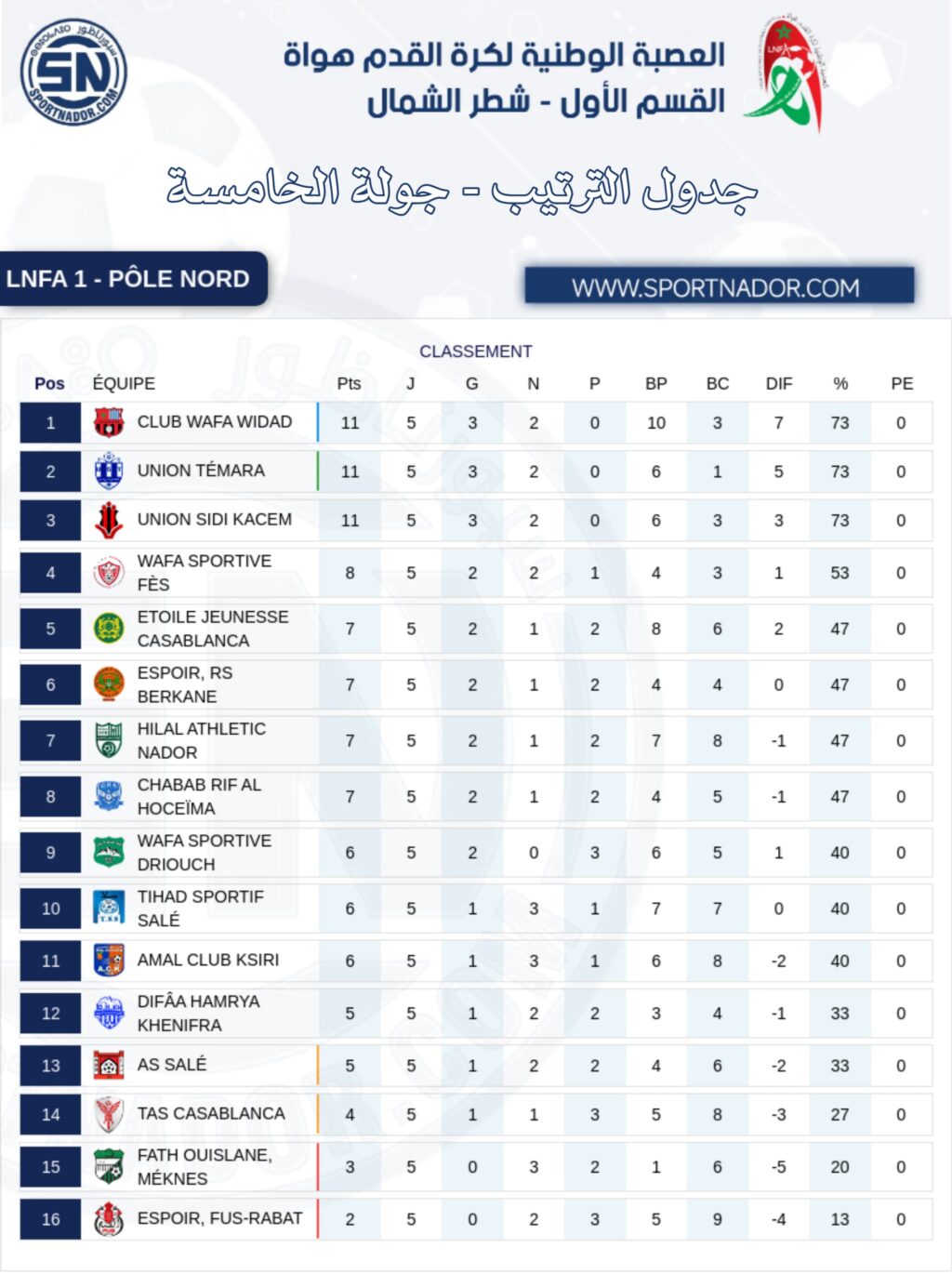 اختُتمت مباريات الجولة الخامسة من القسم الأول هواة، والتي عرفت مواصلة فريق اتحاد تمارة تألقه بعد تحقيقه نتيجة إيجابية مكنته من الانفراد بصدارة الترتيب برصيد 11 نقطة.